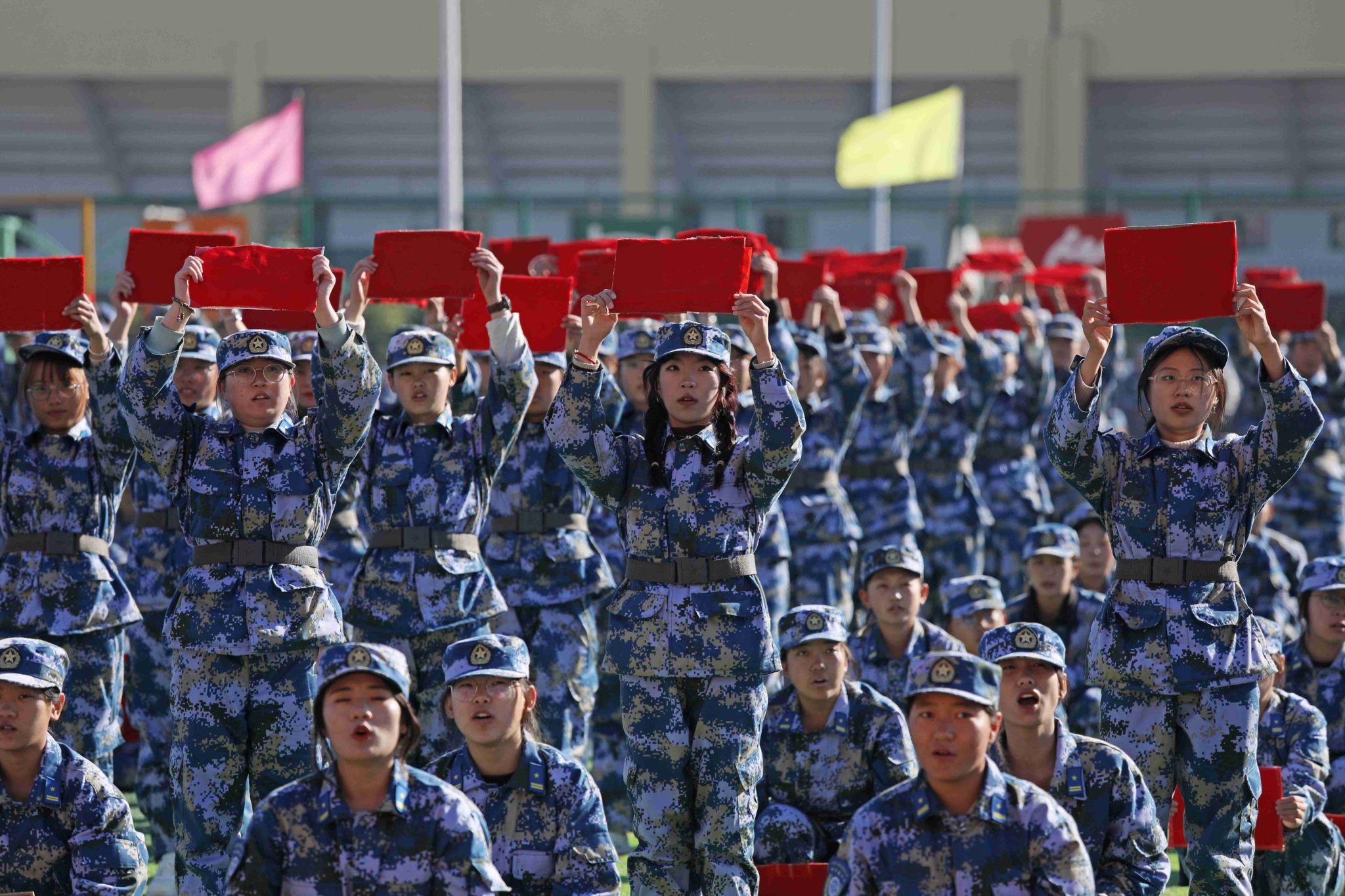 天韵方队的创意军事训练表演率先登场,400名新生团结一心、热情洋溢,用手中的红色方牌展示出一组组数字,回顾百年大党的光辉历程。