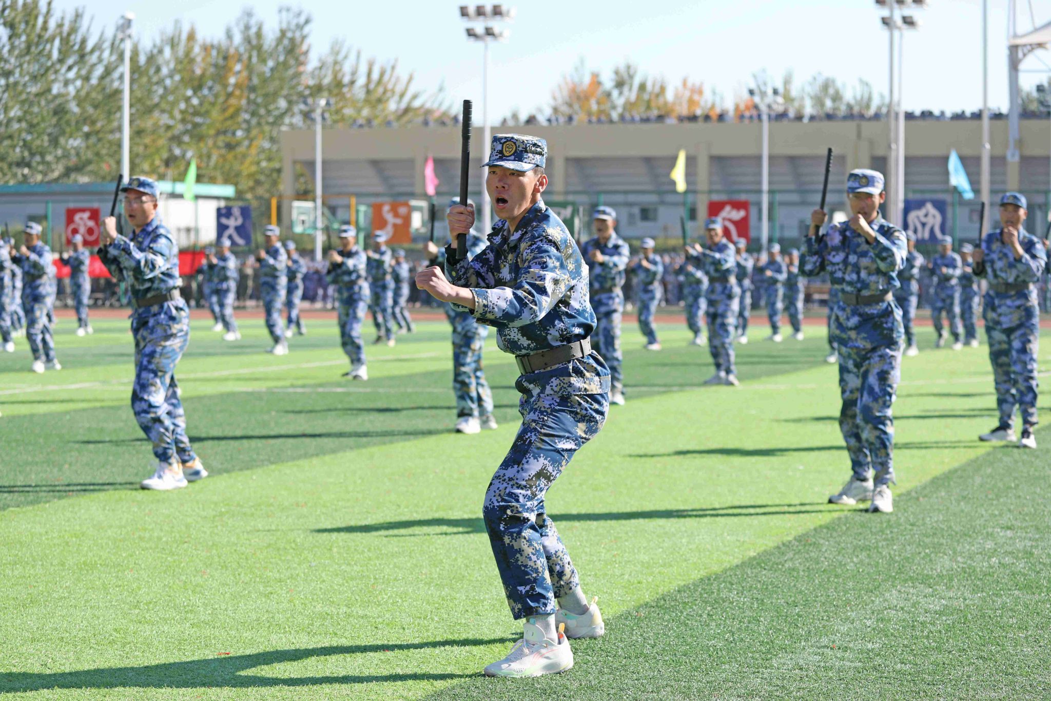 在军事训练科目展示中,新生们用标准的匕首操、警棍术、擒敌拳来展示丰硕的军事训练成果,他们的动作刚劲有力、气势如虹,赢得现场阵阵掌声。