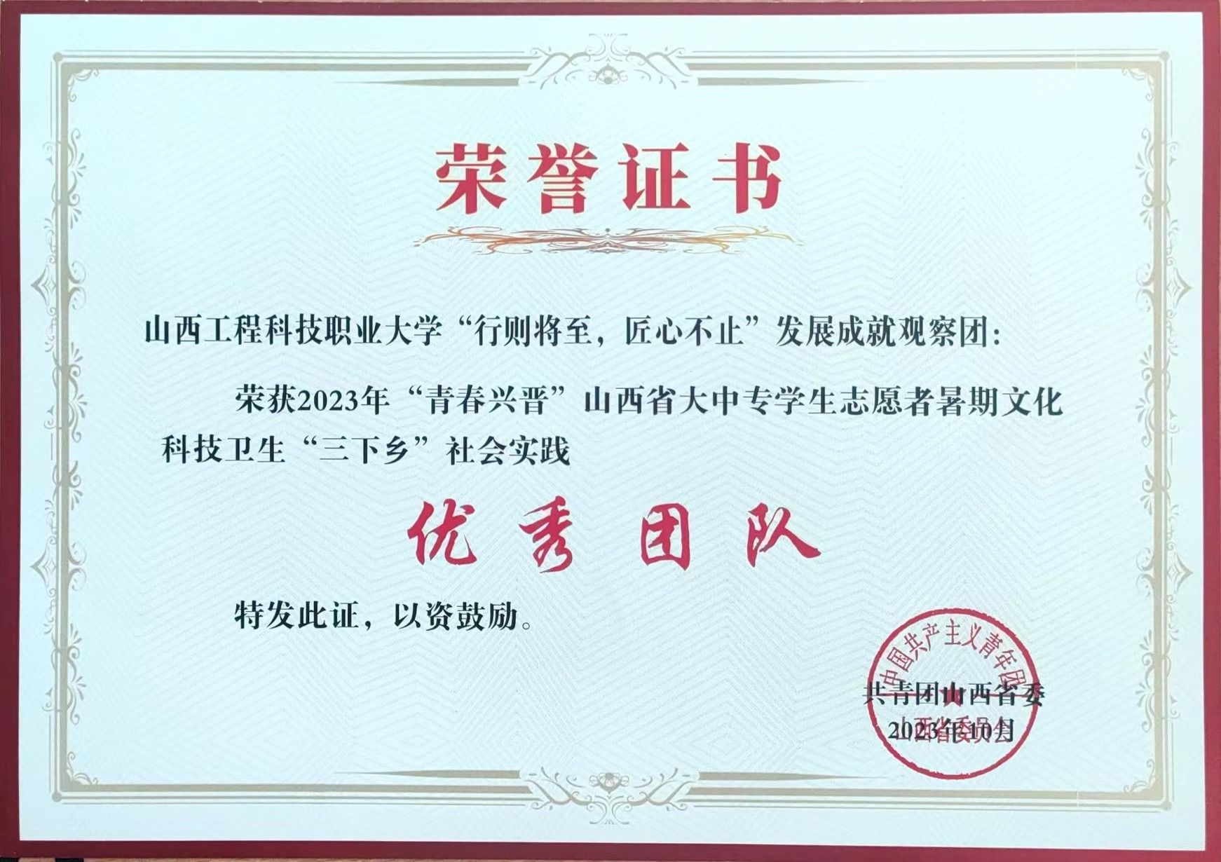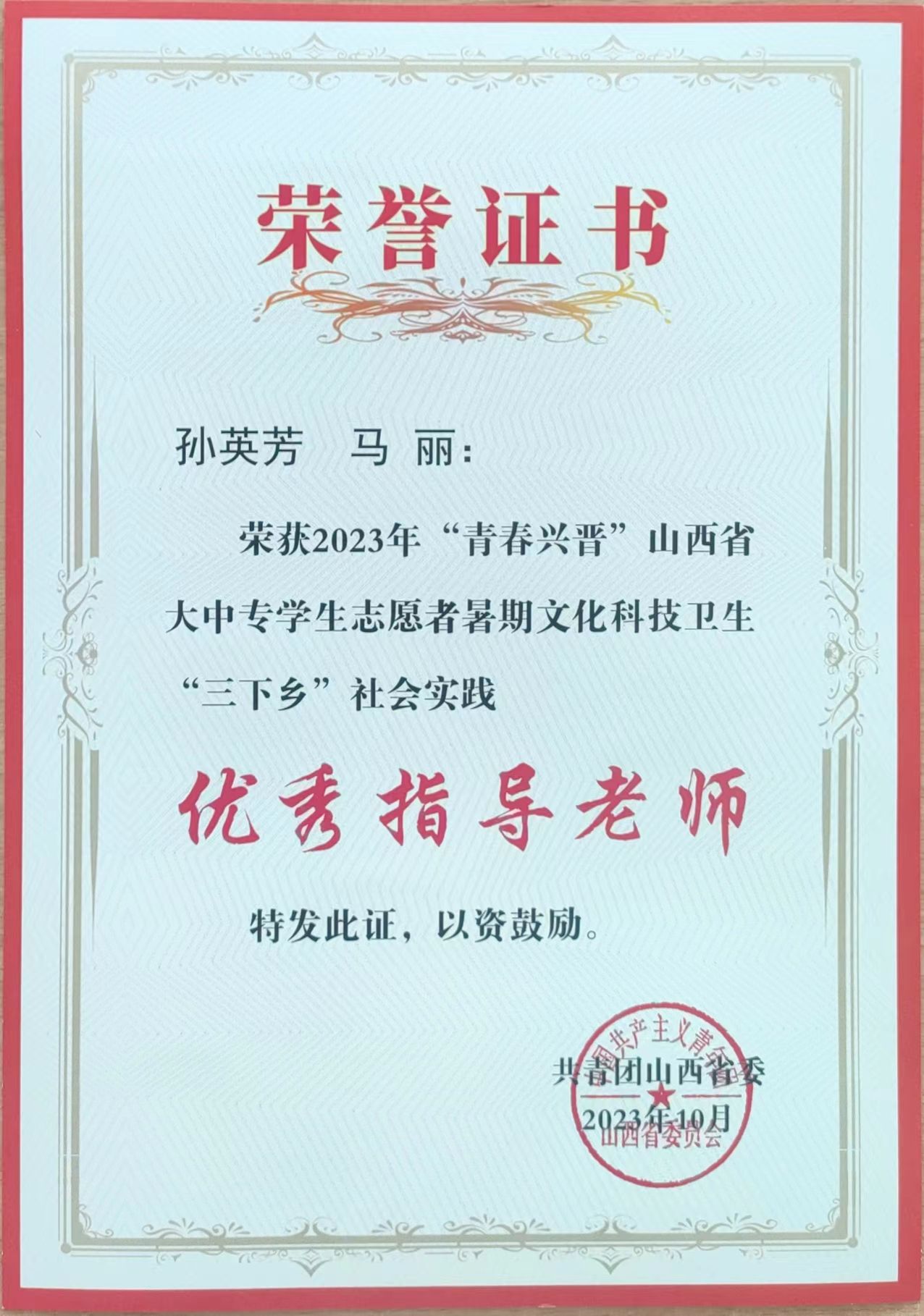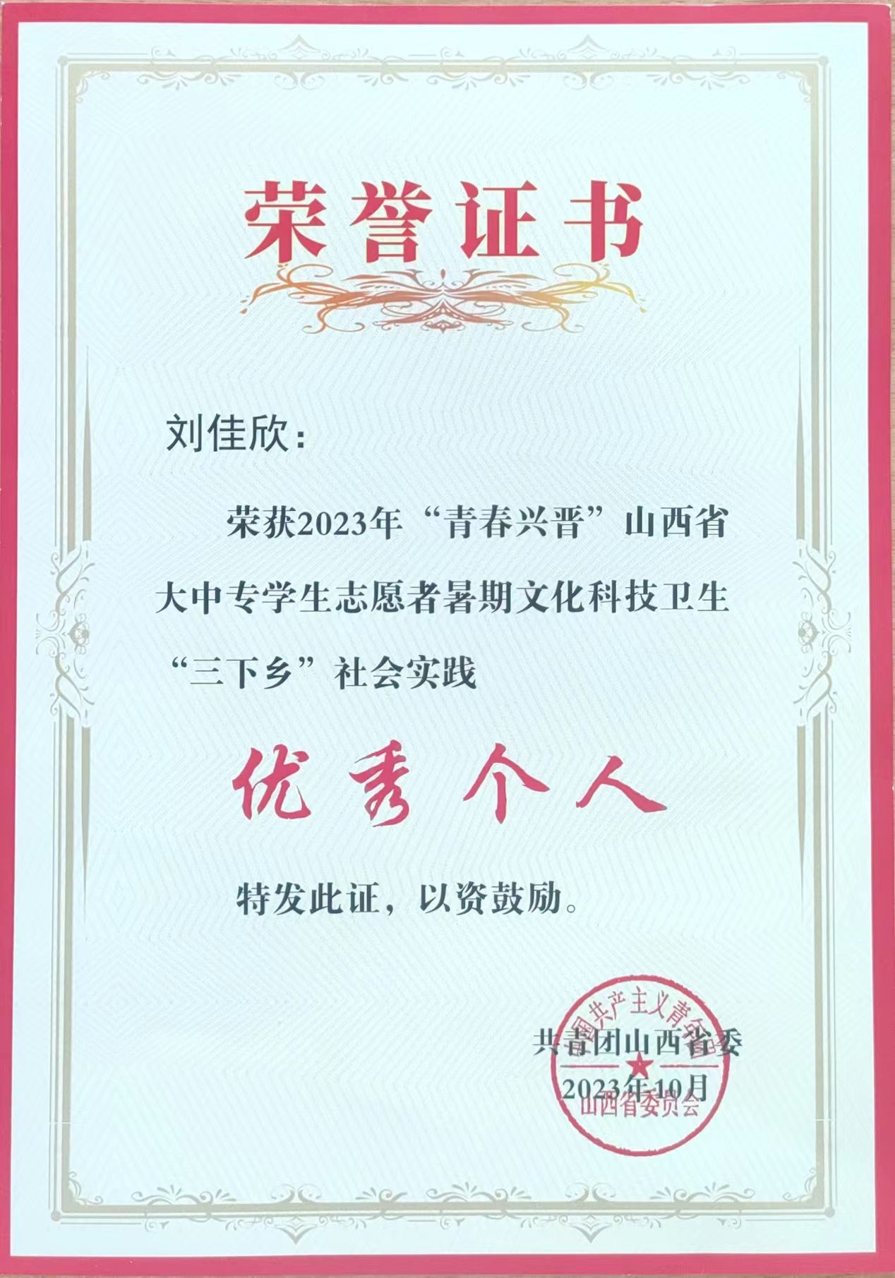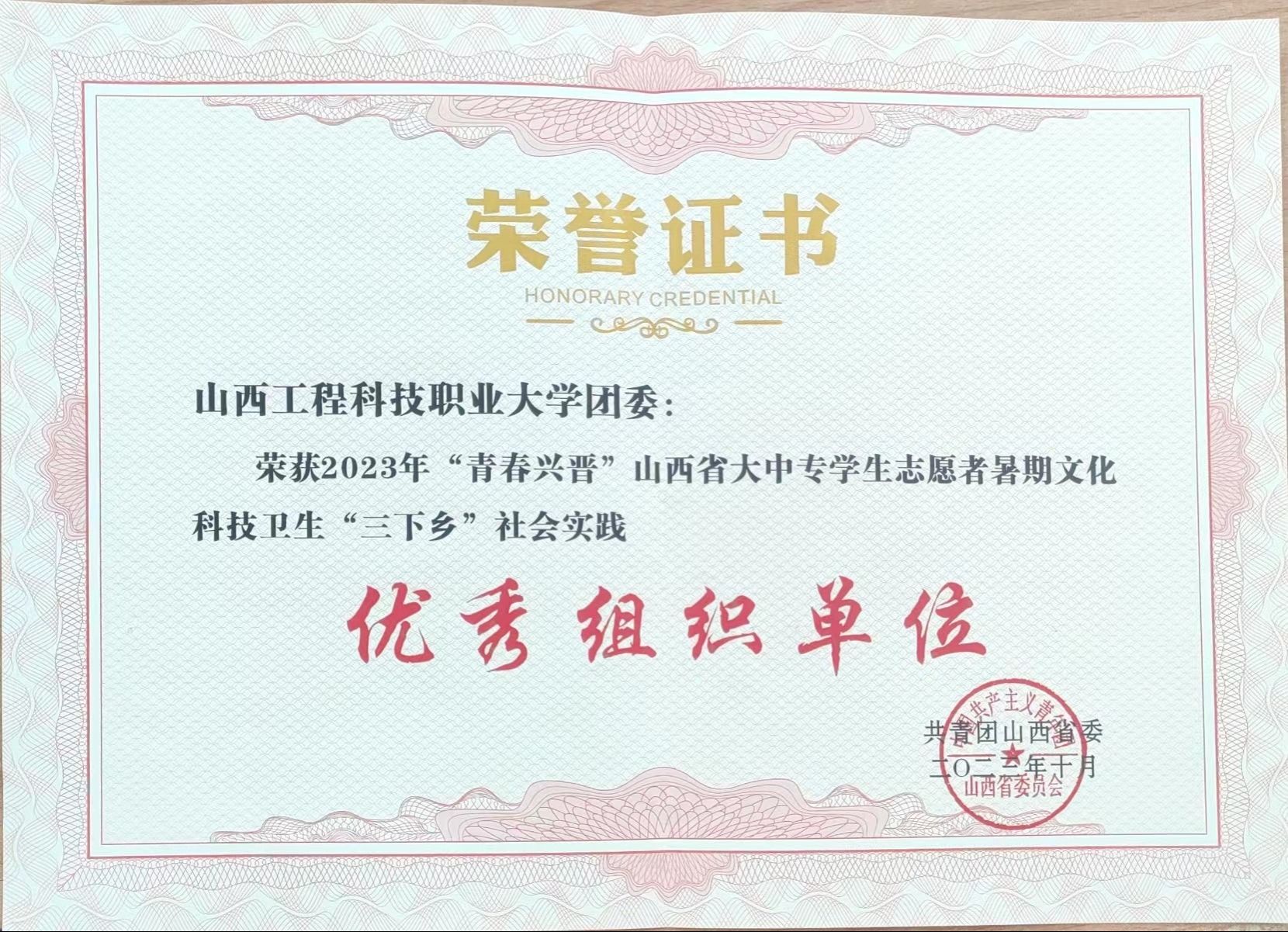 近日,共青团山西省委发布《关于通报表扬2023年山西省“三下乡”社会实践工作中表现突出集体和个人的通知》,我校团委荣获2023年“青春兴晋”山西省大中专学生志愿者暑期文化科技卫生“三下乡”社会实践优秀组织单位,由校团委推荐的建筑设计学院“行则将至 匠心不止”实践团队荣获优秀团队,指导教师孙英芳、马丽荣获优秀指导教师,会计学院学生刘佳欣荣获优秀个人。