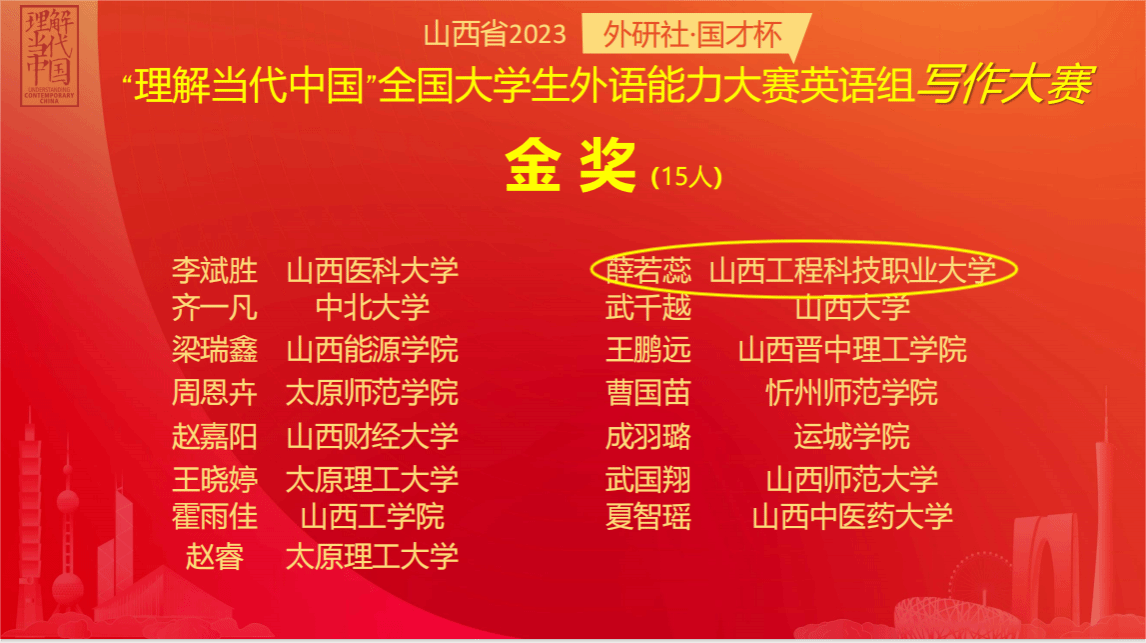 近日,“外研社•国才杯”“理解当代中国”英语组演讲、阅读、写作、口译、笔译和多语种组比赛山西赛区复赛,2023“中国教育电视台·外研社杯”职场英语挑战赛演讲、写作大赛山西赛区比赛在我省落下帷幕。经过初赛和复赛的层层选拔,由我校外国语学院派出的代表队在两项竞赛中喜获佳绩,为学校赢得了荣誉。
