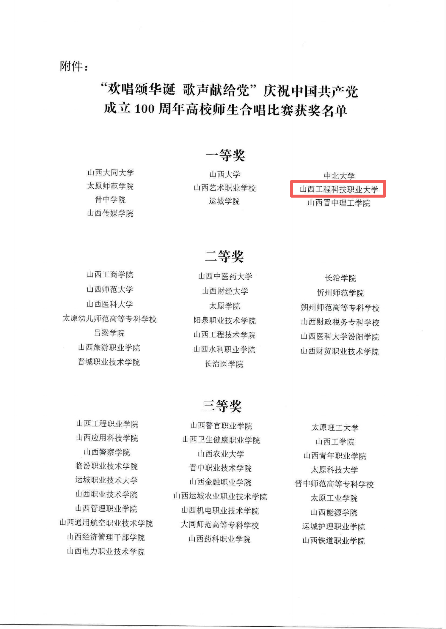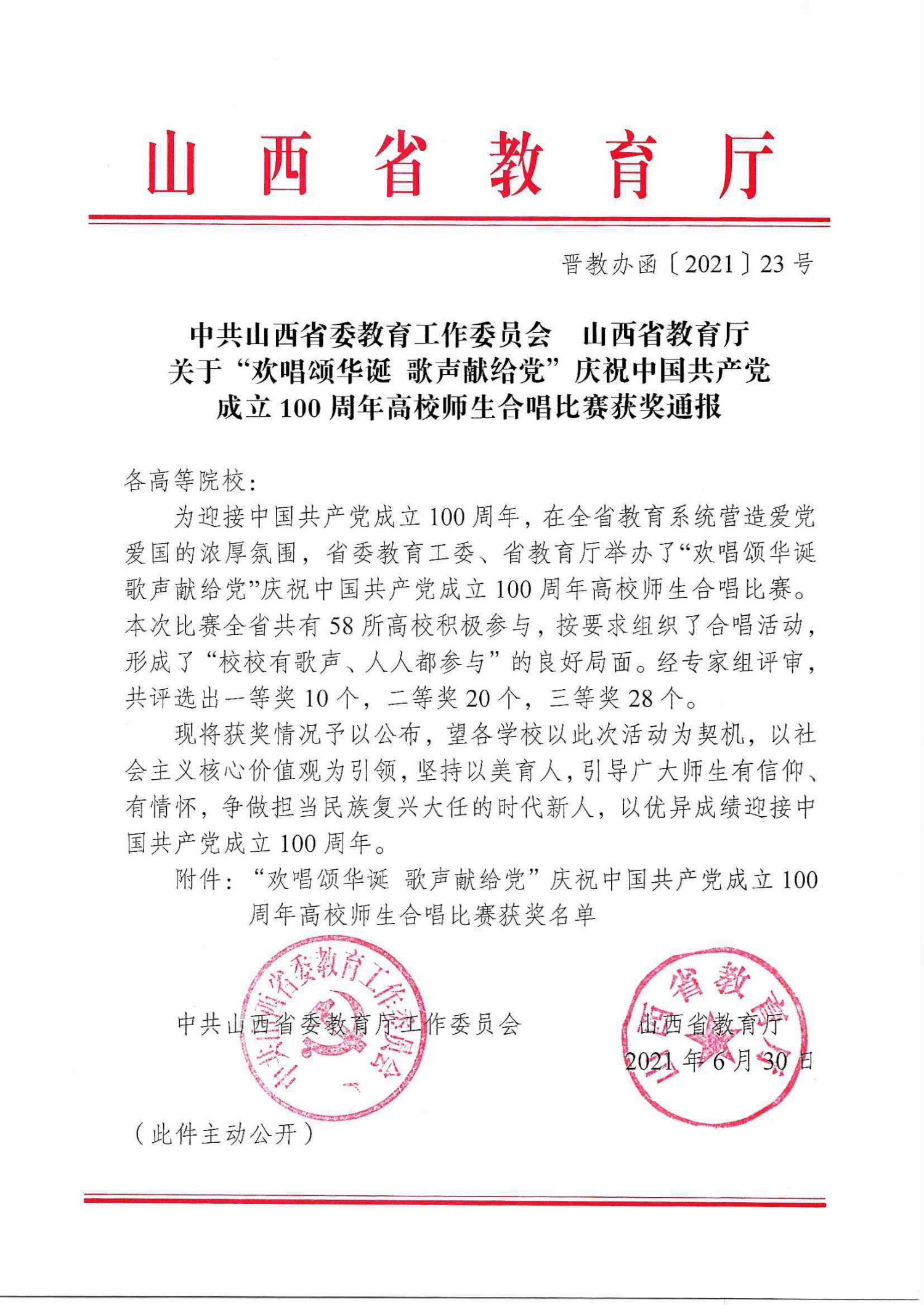 为迎接中国共产党成立100周年,营造爱党爱国的浓厚氛围,省委教育工委、省教育厅举办了“欢唱颂华诞歌声献给党”庆祝中国共产党成立100周年高校师生合唱比赛。我校参演的《共产党一心为中国》(原创)、《旗帜颂》两首歌曲,以稳定的发挥和出色的表现,在全省50余所高校参赛队中脱颖而出,荣获一等奖。