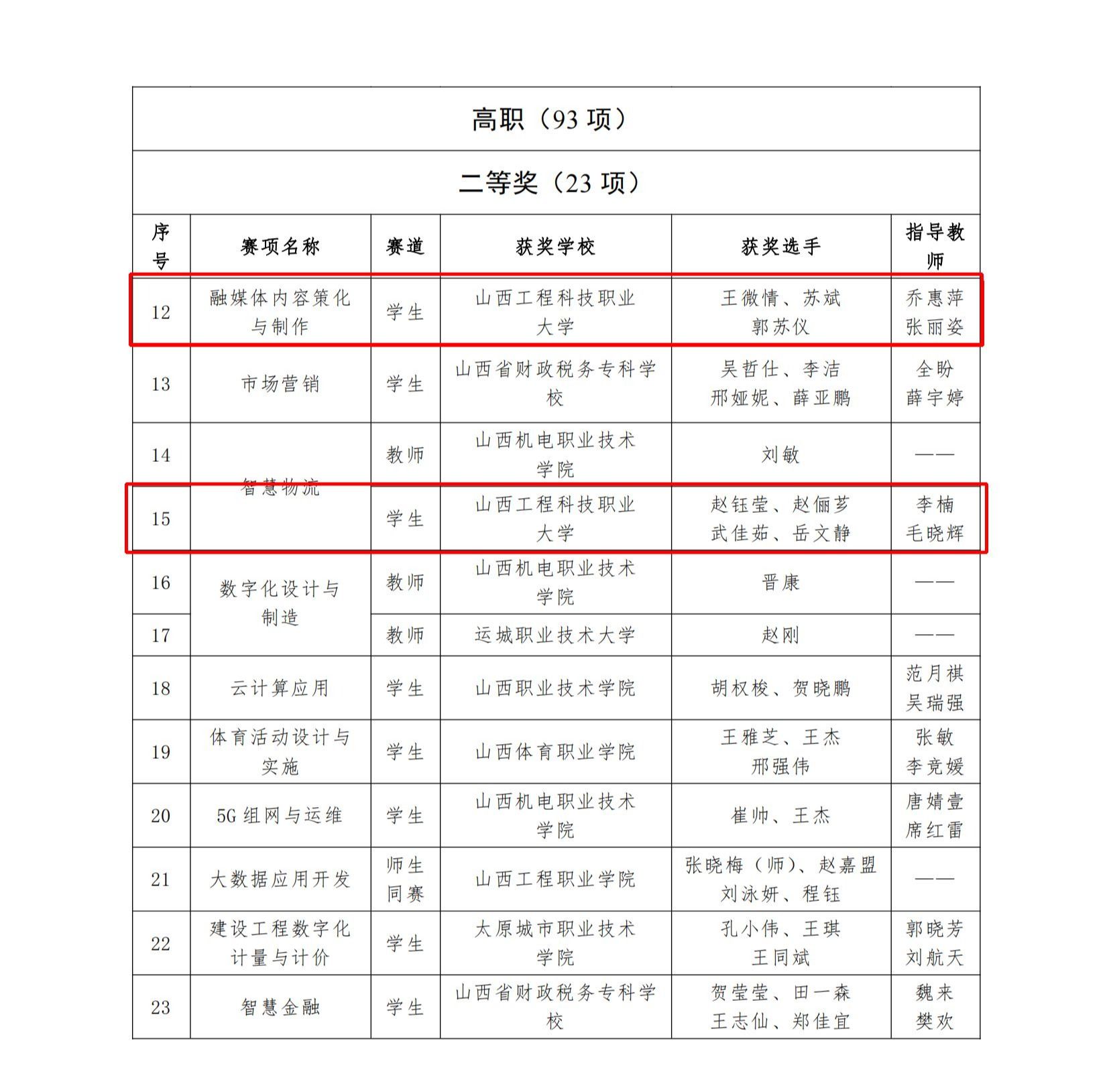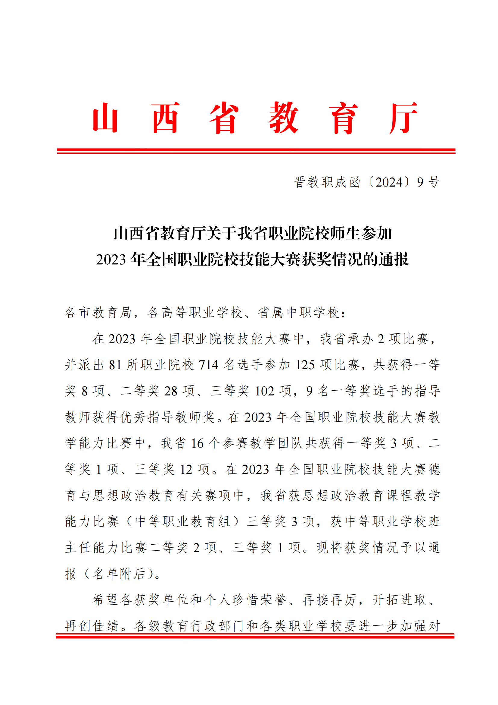 近日,山西省教育厅通报了我省职业院校师生参加2023年全国职业院校技能大赛获奖情况,我校师生凭借过硬的专业能力和出色的赛场表现在2023年全国职业院校技能大赛中斩获二等奖2项、三等奖6项的喜人成绩。