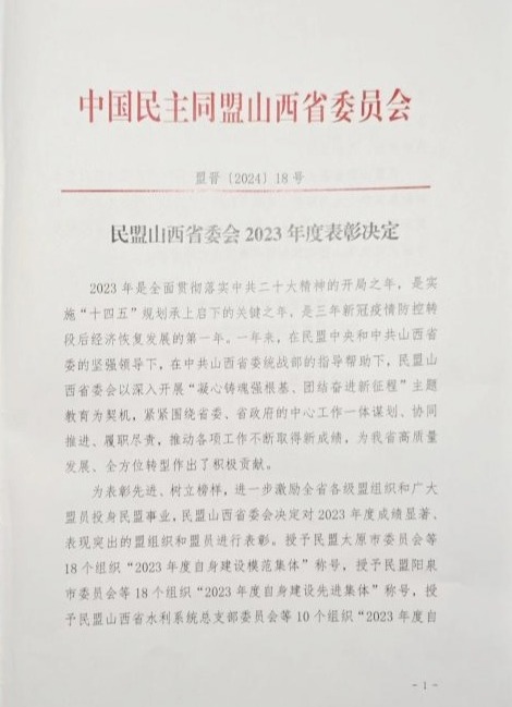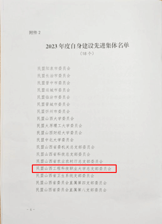 近日,民盟山西工程科技职业大学总支部被民盟山西省委会授予2023年度“先进集体”荣誉称号,盟员安淑珍老师获评“盟务工作先进个人”。