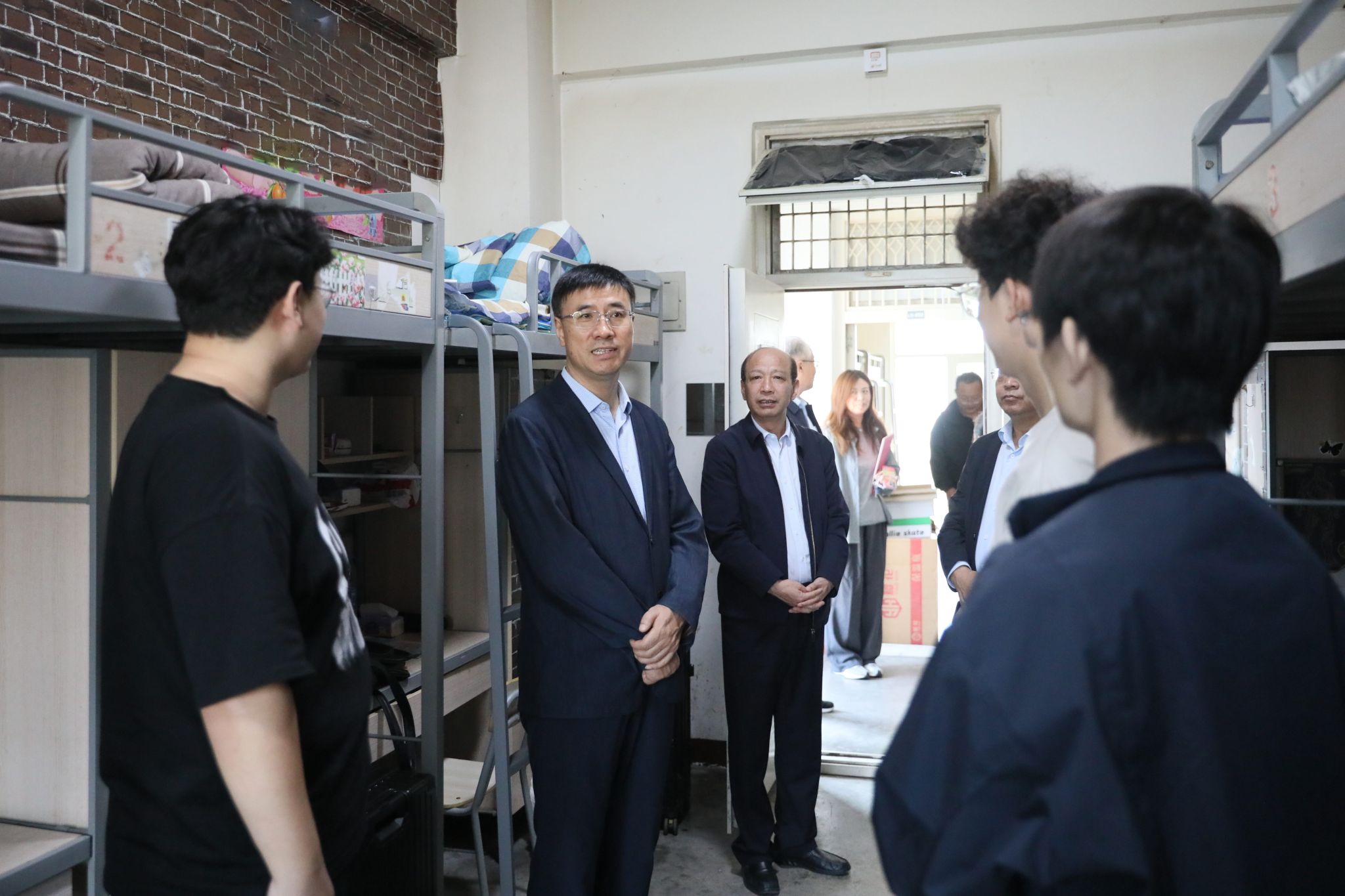 在学生公寓,学校领导询问新生入学适应情况,勉励他们尽快适应新的学习生活环境,精心规划大学生涯,珍惜宝贵时光,深耕专业领域,树立青春志向,实现青春梦想。