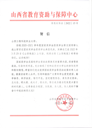 近日,省教育厅教育资助与保障中心向我校发来贺信,祝贺学校2020-2021学年度国家奖学金获奖学生优秀代表郭文丽同学的事迹被3月29日《山西晚报》刊登报道。