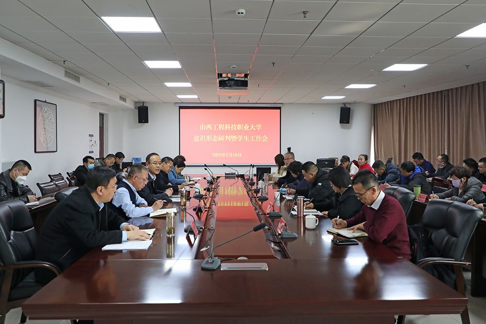 2月16日下午,我校在文华校区行政1号楼902会议室召开意识形态研判暨学生工作会。校党委副书记乔忠华,党政办公室、党委宣传部、教务部、学生工作部、校团委、产教融合中心、思政部相关负责人,各二级学院党委第二负责人(专职)及学生工作部全体教职工参加会议。