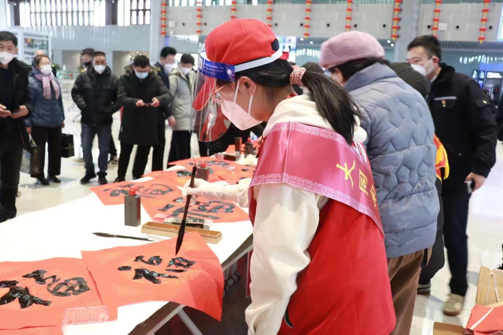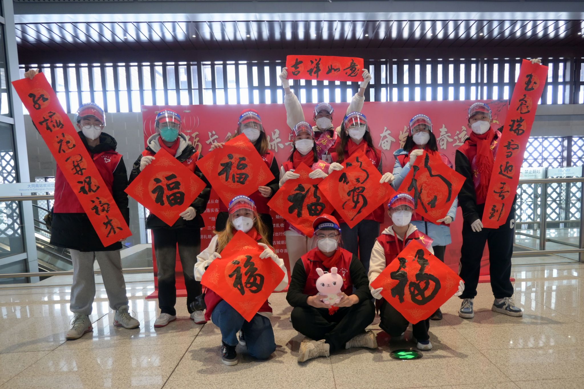 春运期间各站点还组织开展“写春联、送万福”活动,我校志愿者也参与其中,书法爱好者们用手中的毛笔写下对兔年的祝福与期盼,营造浓厚的节日氛围,凝心聚力保证春运安全。