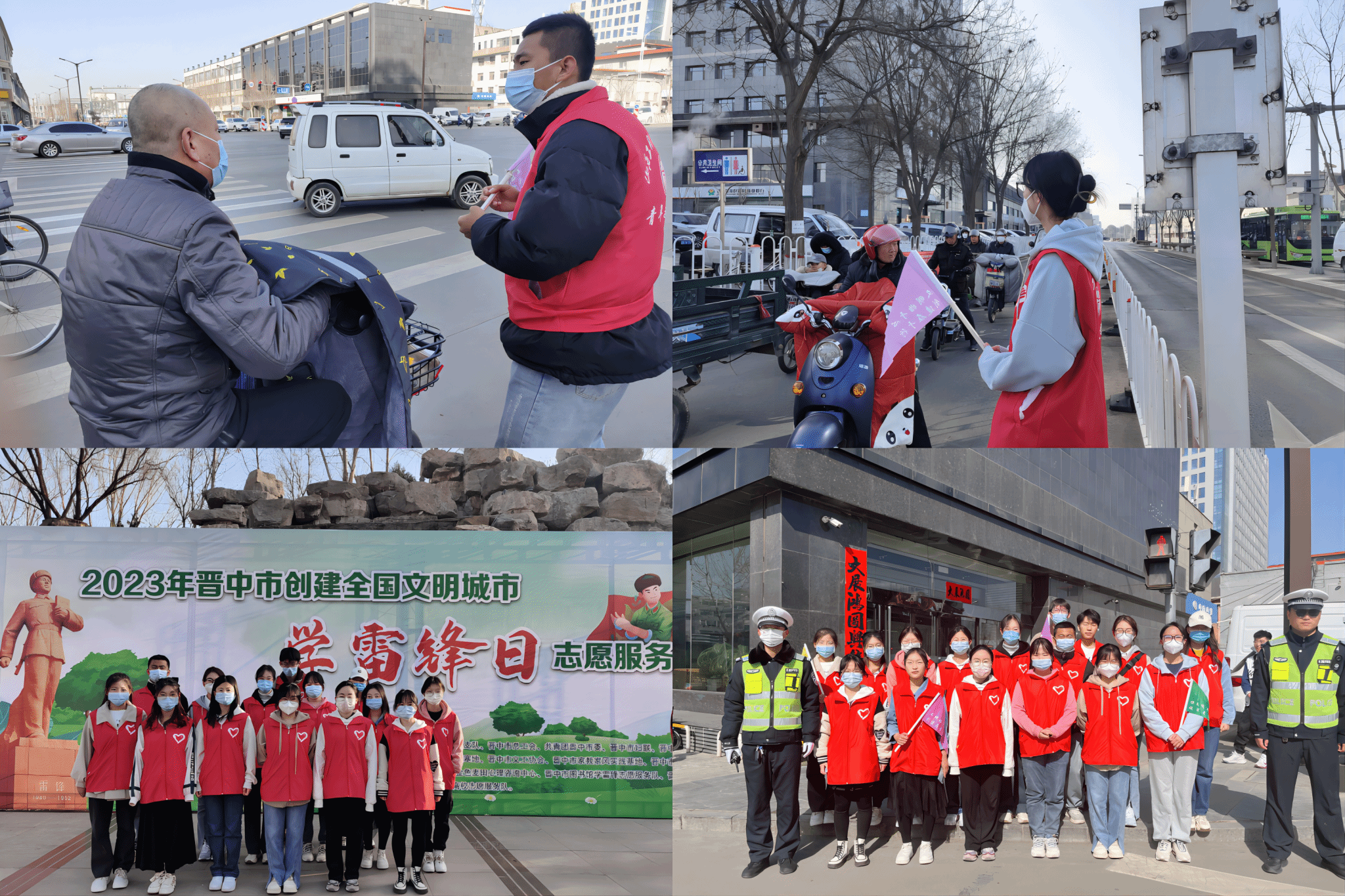3月5日上午,我校青年志愿服务中心积极响应晋中新青年高校志愿者联合中心“学雷锋”大型服务活动的号召,带领15名志愿者在晋中市城区主干道交岔路口和沿线,配合执勤交警,开展文明劝导、交通秩序维护、制止违章行为、宣传文明安全出行等相关志愿服务。用自己的实际行动彰显并宣传了新时代的雷锋精神。