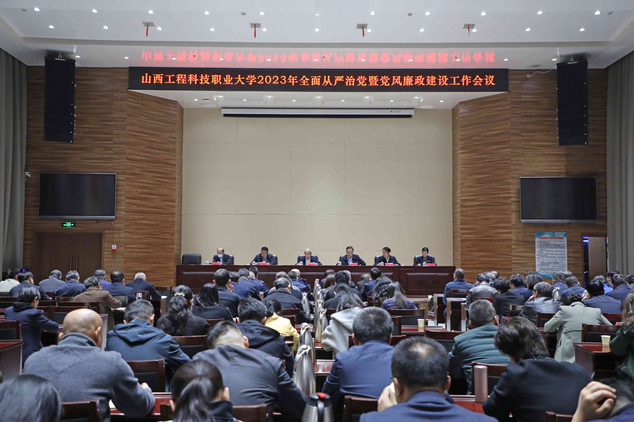 会议共分为两个阶段进行。第一阶段召开全面从严治党暨党风廉政建设工作会议。会上,纪委书记郭建平从“强化政治监督,推动全面从严治党向纵深发展”“做实日常监督,推动校内监督取得更大治理效能”“坚持守正创新,着力创建‘山西省清廉学校示范单位’”“科学研判政治生态,精准开展‘政治画像’”等方面回顾了学校2022年纪检监察工作,并对2023年纪检监察主要工作进行安排部署:一是坚定不移推进政治监督具体化精准化常态化,确保党的二十大精神和省委决策部署落地见效;二是持之以恒完善自我革命制度规范体系,提升协同监督合力监督效能;三是持之以恒落实中央八项规定精神,全面加强党的纪律建设;四是持之以恒全面建设清廉校园,扎实推进政治生态实现持久风清气正;五是坚持深化改革,推动高校纪检监察体制改革取得实效;六是持之以恒加强自身建设,锻造对党绝对忠诚、敢于善于斗争、自身正自身硬的纪检监察铁军。