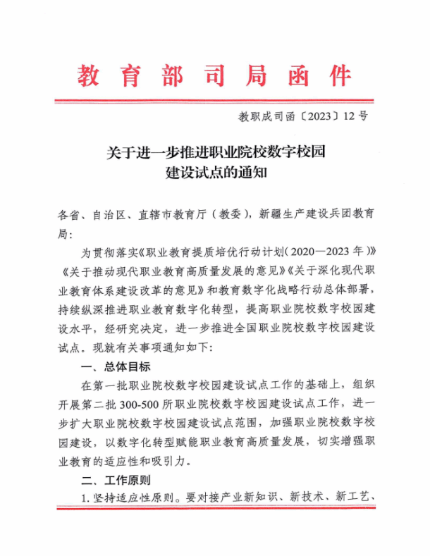 近日,教育部发布了《关于进一步推进职业院校数字校园建设试点的通知》(教职成司函〔2023〕12号),我校成功入选教育部第一批职业院校数字校园建设试点单位。