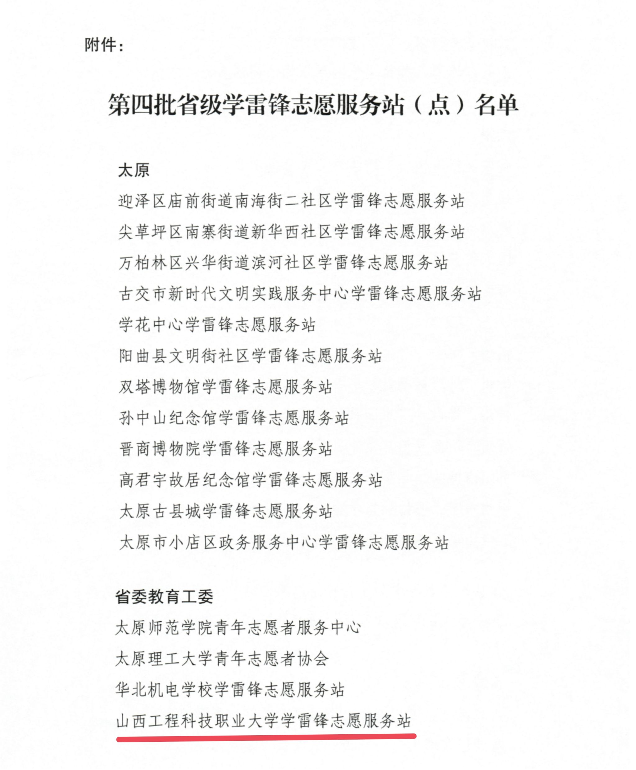 近日,山西省文明办下发《关于确定第四批省级学雷锋志愿服务站(点)的通知》(晋文明办〔2023〕21号),确定第四批省级学雷锋志愿服务站点,其中由校团委青年志愿服务中心与交通工程学院学雷锋小组共同组建的学雷锋志愿服务站成功入选。