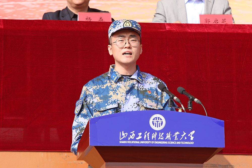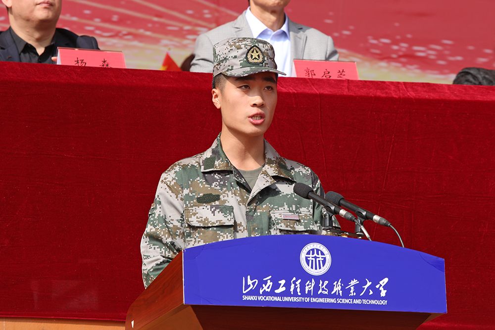 教官代表冯涛作军训动员。他表示,军事训练是大学生涯中的重要一课,希望同学们发扬不畏艰难困苦的精神,服从命令,听从指挥,经历提升人格、净化心灵的人生洗礼;学校2022年度“十佳辅导员”文法学院李娟代表2023级新生班辅导员发言,她希望同学们能够在军事训练中做到严格守时、服从命令、听从指挥、学会坚持,做一支纪律严明、作风优良、士气高昂的队伍;建筑设计学院新生贾証凯代表参训的2023级新生发言,他结合自己的服役经验与大家分享对于军训的认识,并希望同学们通过短暂的军旅生活培养坚强的意志和优良的品质,更快更好适应未来的大学生活。