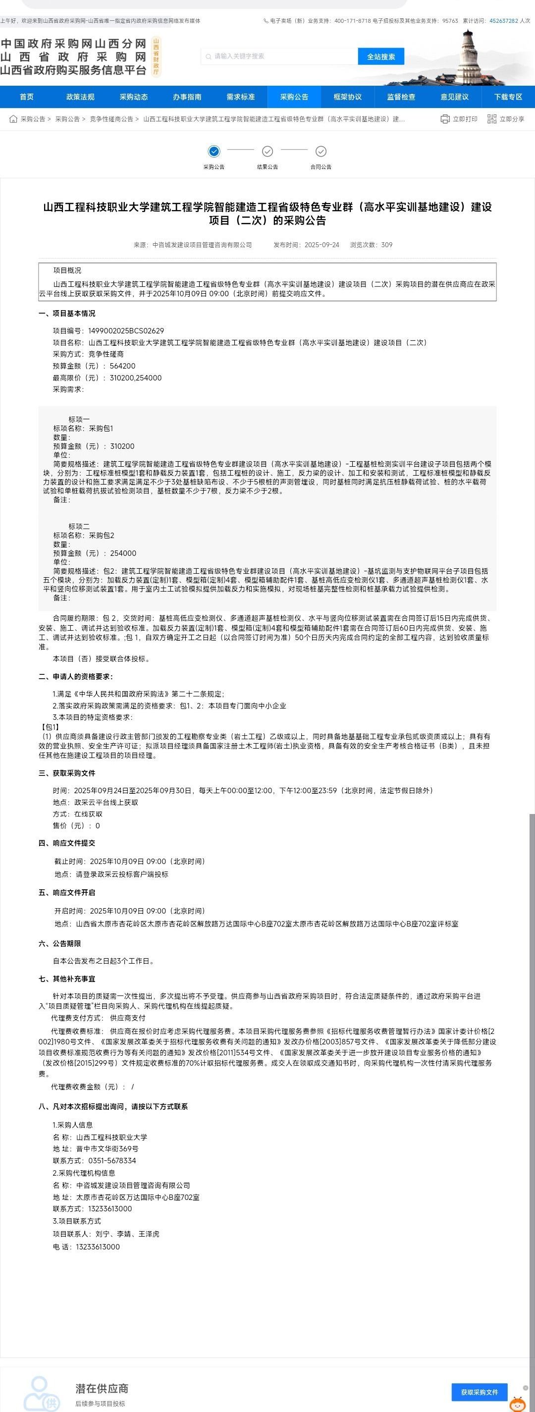 山西工程科技职业大学建筑工程学院智能建造工程省级特色专业群(高水平实训基地建设)建设项目(二次)的采购公告