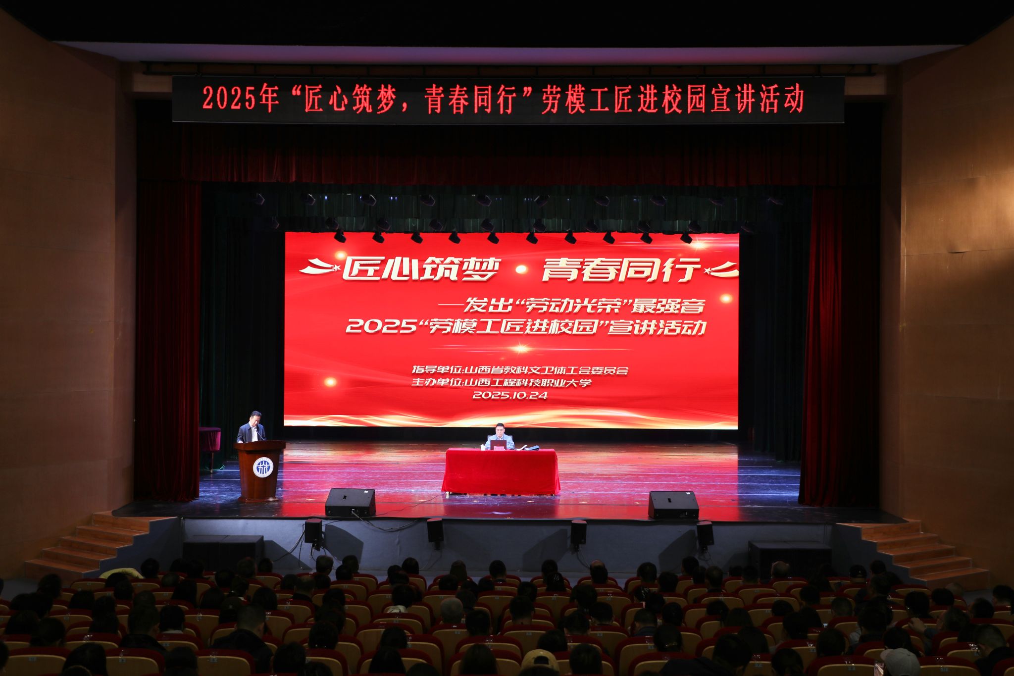 10月24日,我校在演艺中心举办“匠心筑梦 青春同行”劳模工匠进校园宣讲活动。特邀请2025年“大国工匠人才”、全国劳动模范、中国宝武太钢集团特级技师牛国栋,进行“匠心筑梦・青春同行——发出‘劳动光荣’最强音”主题宣讲。全体校领导出席活动,全校各部门负责人、各二级学院师生代表共计八百余人到场聆听。宣讲活动由校党委副书记梁晓军主持。