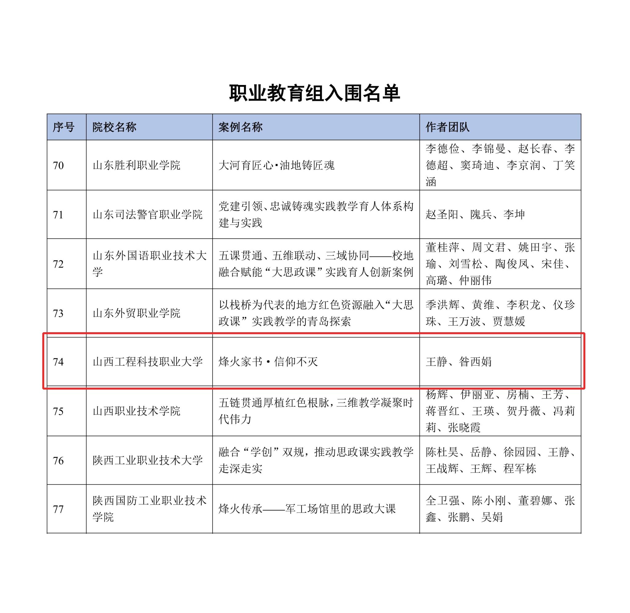 近日,由高等教育出版社和新华网联合举办的高校“大思政课”实践教学典型案例征集活动入选名单揭晓。经过严格遴选,全国共有292个案例成功入围,我校申报的《烽火家书·信仰不灭》案例在职业教育组中榜上有名,展现出学校深化“大思政课”建设的扎实成效与亮眼成果。