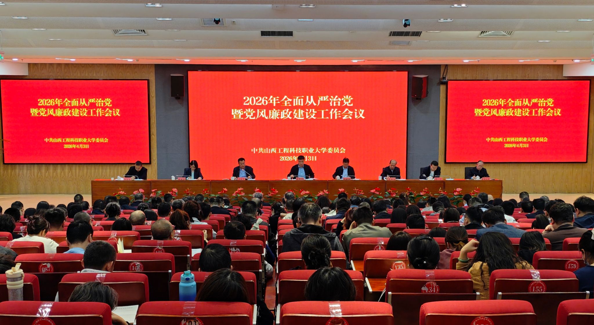 4月3日,我校在2号图书馆报告厅召开2026年全面从严治党暨党风廉政建设工作会议。全体校党委领导班子成员出席会议。校党委书记秦华伟作讲话,纪委书记郭建平部署党风廉政建设工作。校党委副书记梁晓军主持会议。