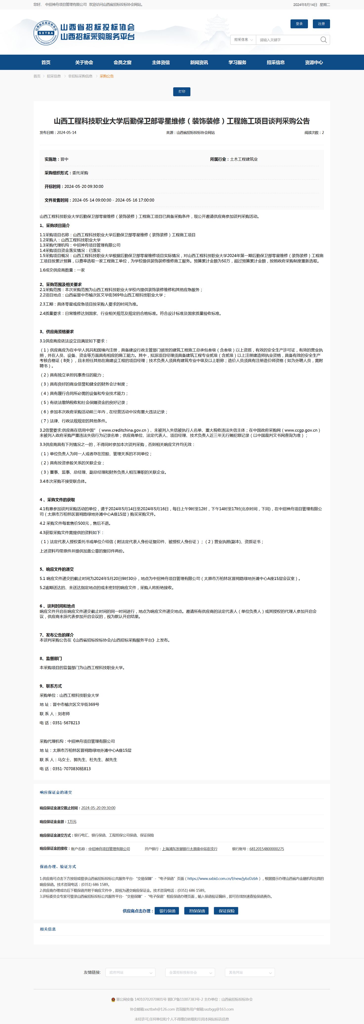 山西工程科技职业大学后勤保卫部零星维修(装饰装修)工程施工项目谈判采购公告