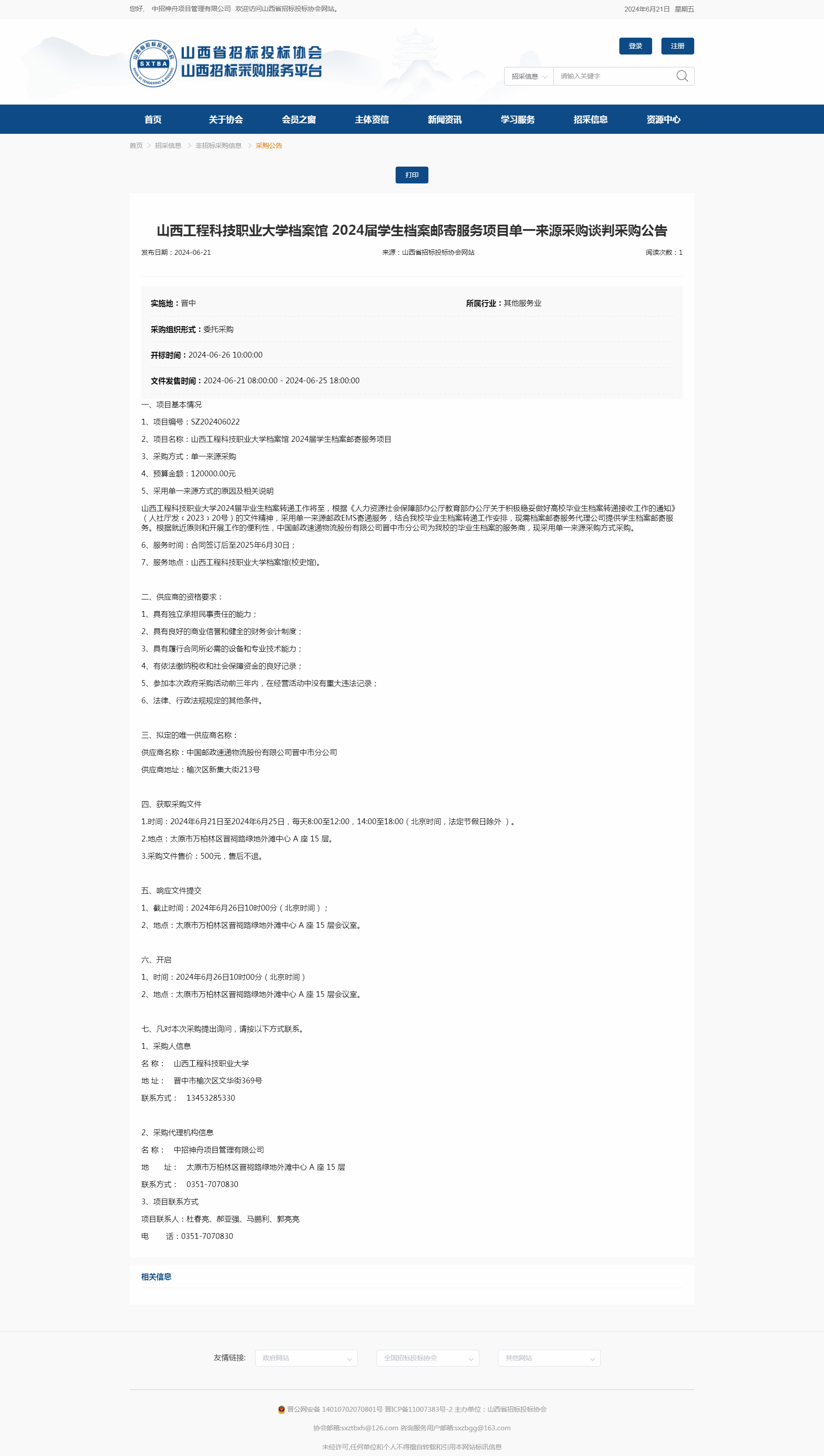 山西工程科技职业大学档案馆2024届学生档案邮寄服务项目单一来源采购谈判采购公告