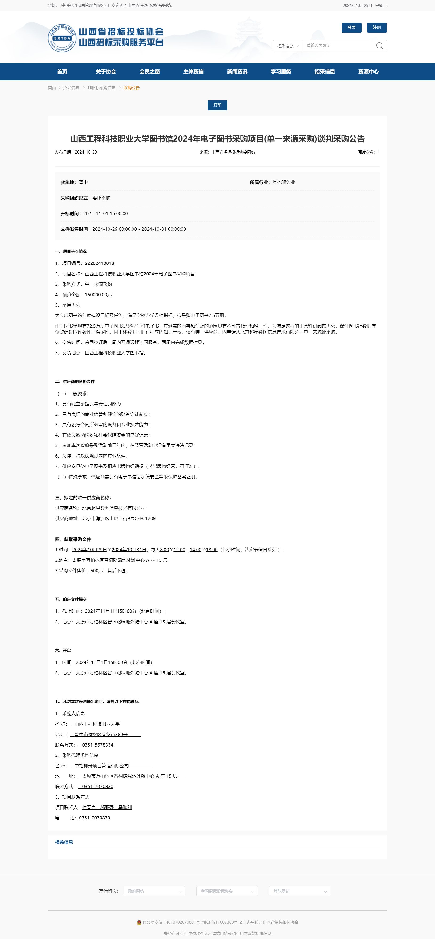 山西工程科技职业大学图书馆2024年电子图书采购项目(单一来源采购)谈判采购公告