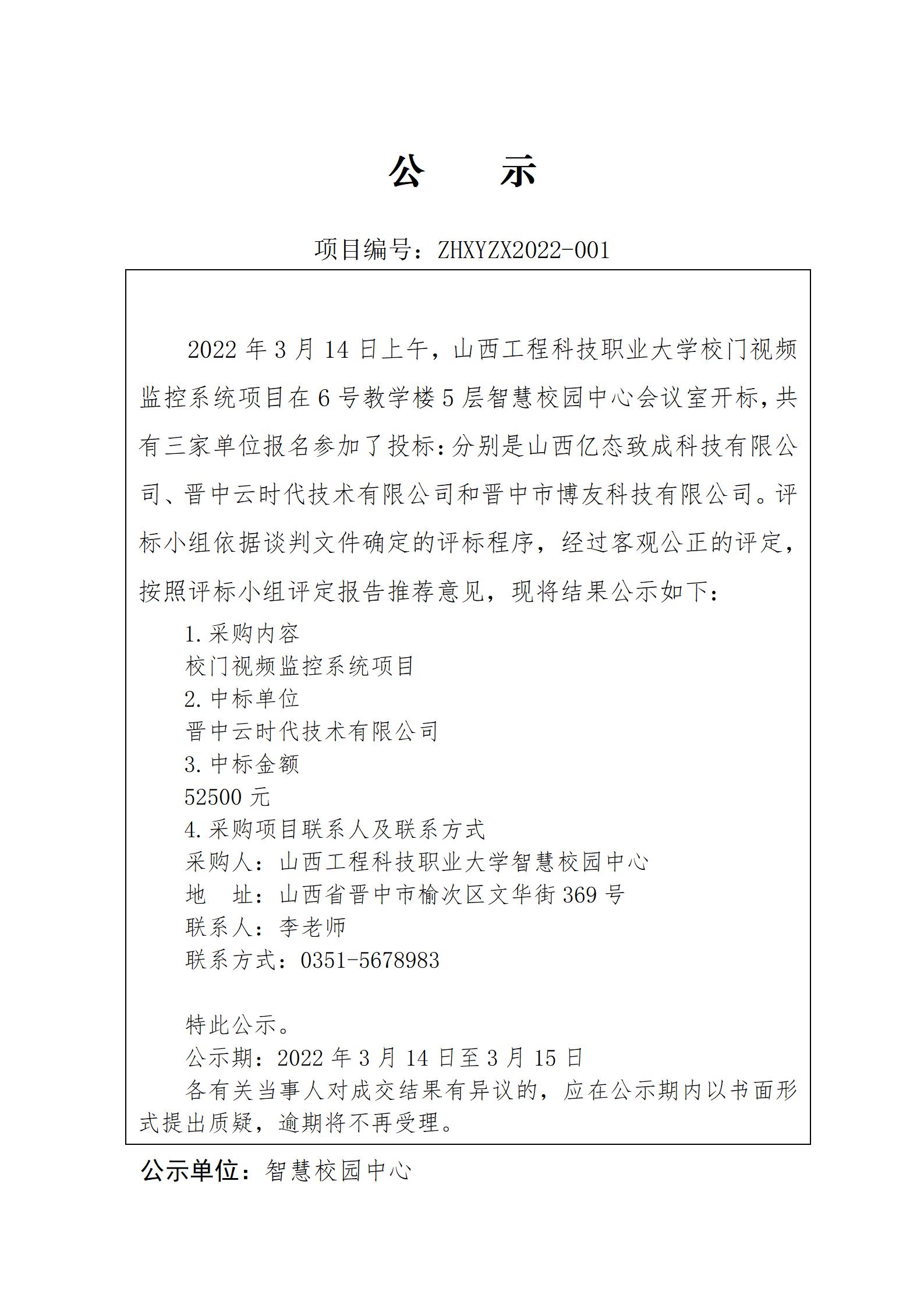 山西工程科技职业大学校门视频监控系统项目谈判中标公示