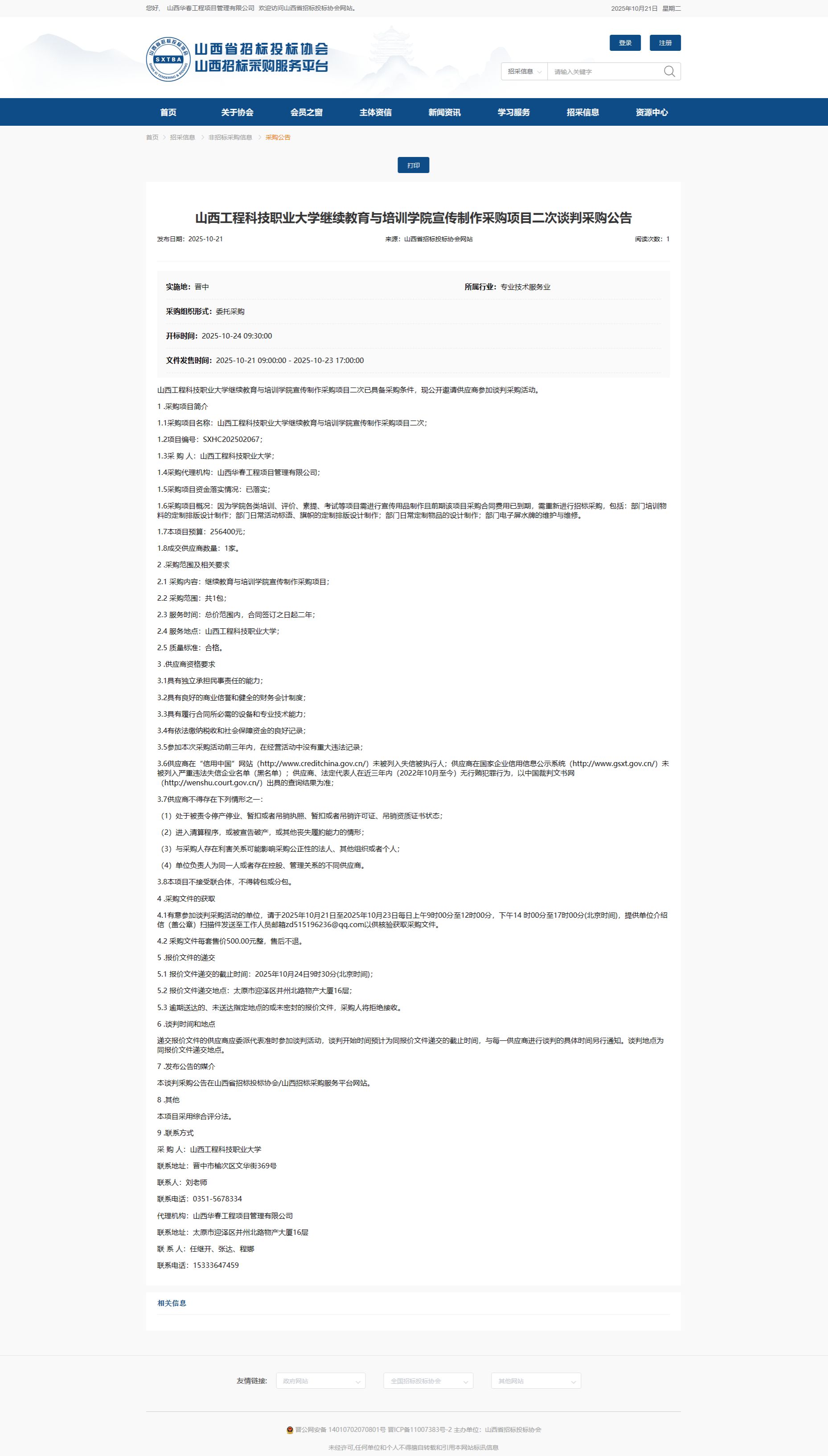 山西工程科技职业大学继续教育与培训学院宣传制作采购项目二次谈判采购公告