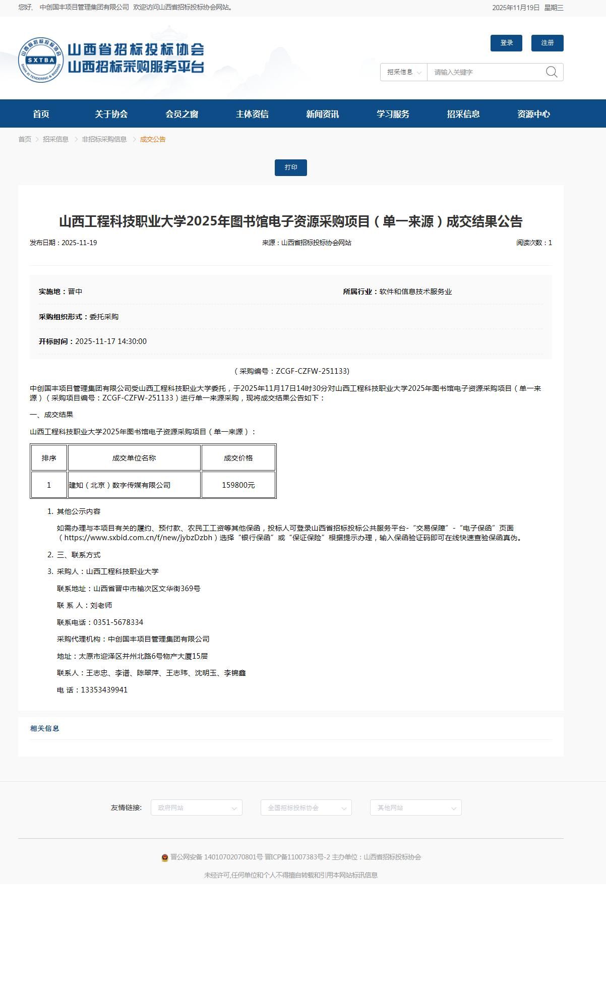 山西工程科技职业大学2025年图书馆电子资源采购项目(单一来源)成交结果公告