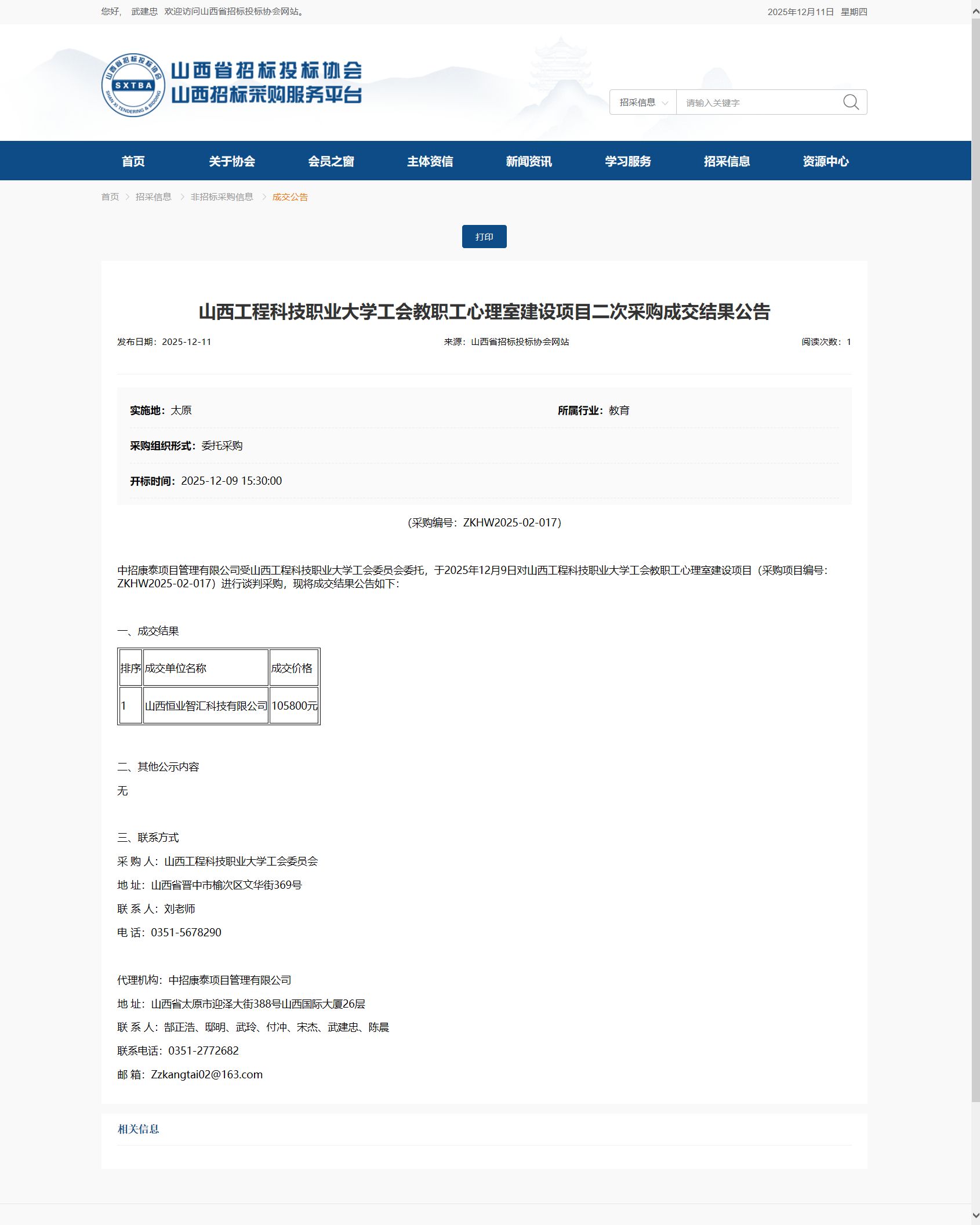 山西工程科技职业大学工会教职工心理室建设项目二次采购成交结果公告