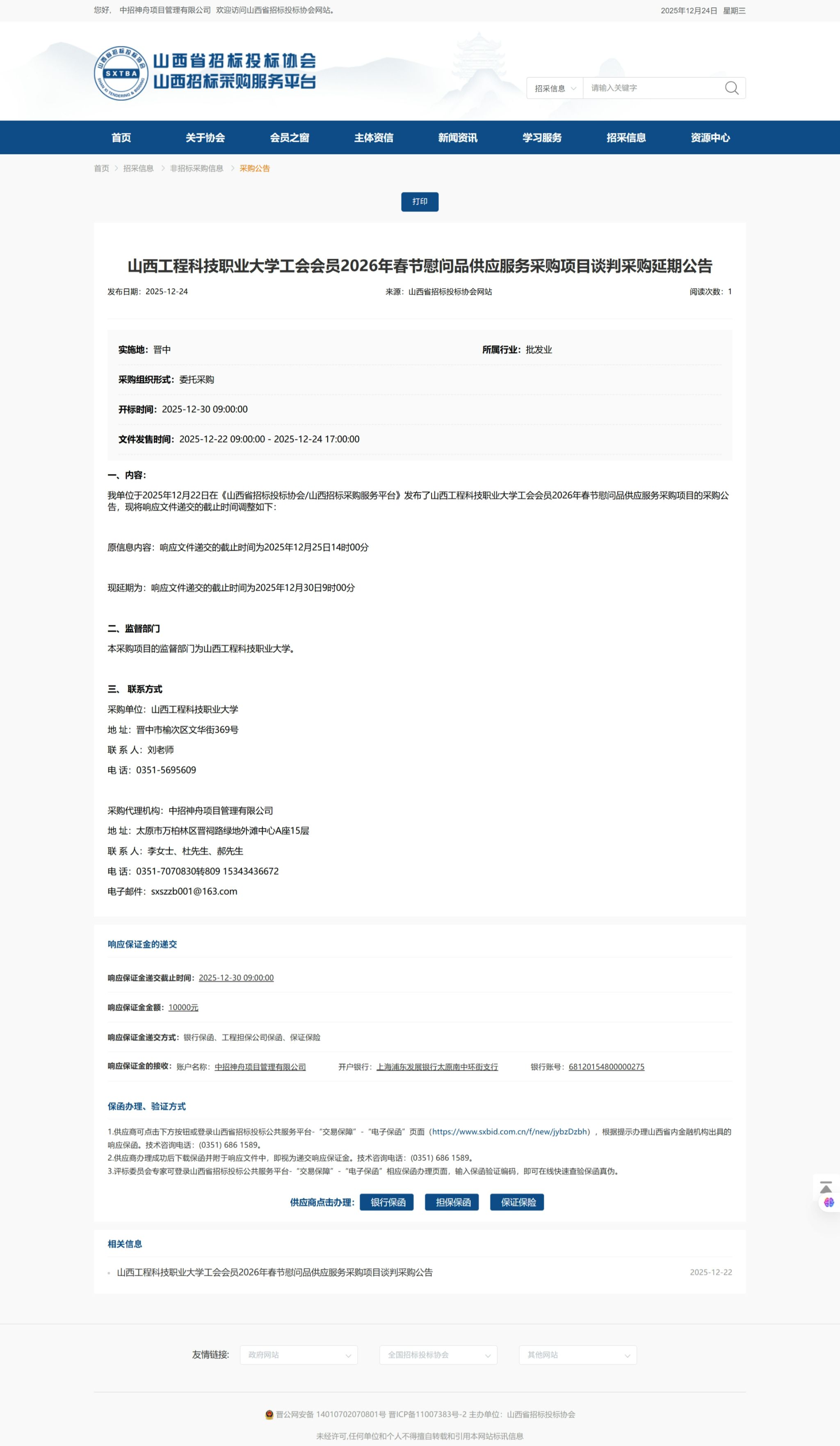 山西工程科技职业大学工会会员2026年春节慰问品供应服务采购项目谈判采购延期公告