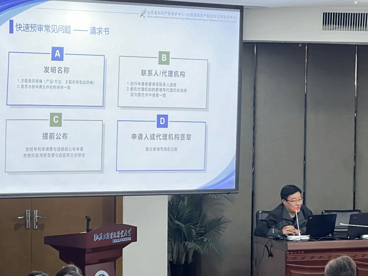 依据我校《“强国由我,技能报国”第二届校园科技文化艺术节实施方案》及2024年全国知识产权宣传周“知识产权转化运用促进高质量发展”主题要求,结合我校教师专利申请实际,为突出职业大学科研特色,促进知识产权转化运用,科技研发与成果转化中心特邀请山西省知识产权保护中心国家专利预审员、知识产权师郑会海于2024年4月23日下午在职业培训中心B区一层报告厅开展主题为《如何进入专利审批快车道》的专题讲座。科技研发与成果转化中心负责人杨宏伟教授主持会议,安全与应急管理学院张毅梅院长、信息工程学院科研副院长冯小玲等院部领导到场聆听,各院部有专利申报意向、已有专利进行申报的160余师生及科技研发与成果转化中心全体工作人员参加讲座。
