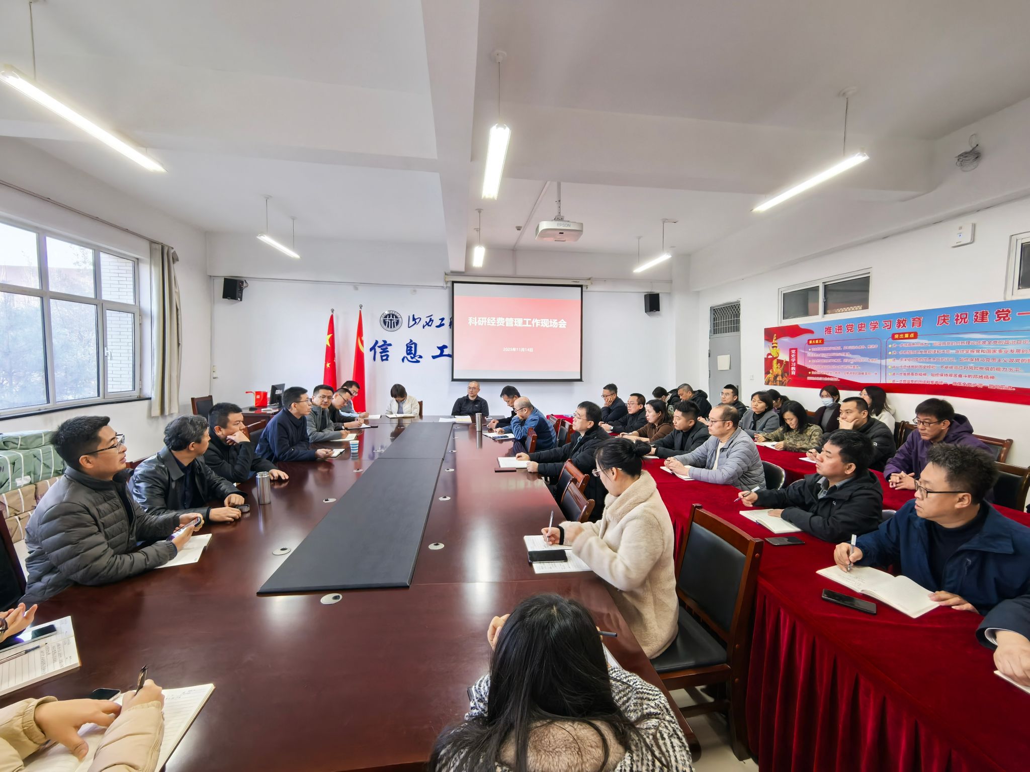 为进一步统一思想、提升意识,细化完善科研过程管理,规范科研经费的使用,2025年11月14日,在信息学院会议室(7号教学楼212室),科研中心组织召开了“科研经费管理工作现场会”。中心相关人员、各院部科研副院长、产教研办公室主任及科研干事50余人参加会议。会议由科研中心负责人杨宏伟教授主持。
