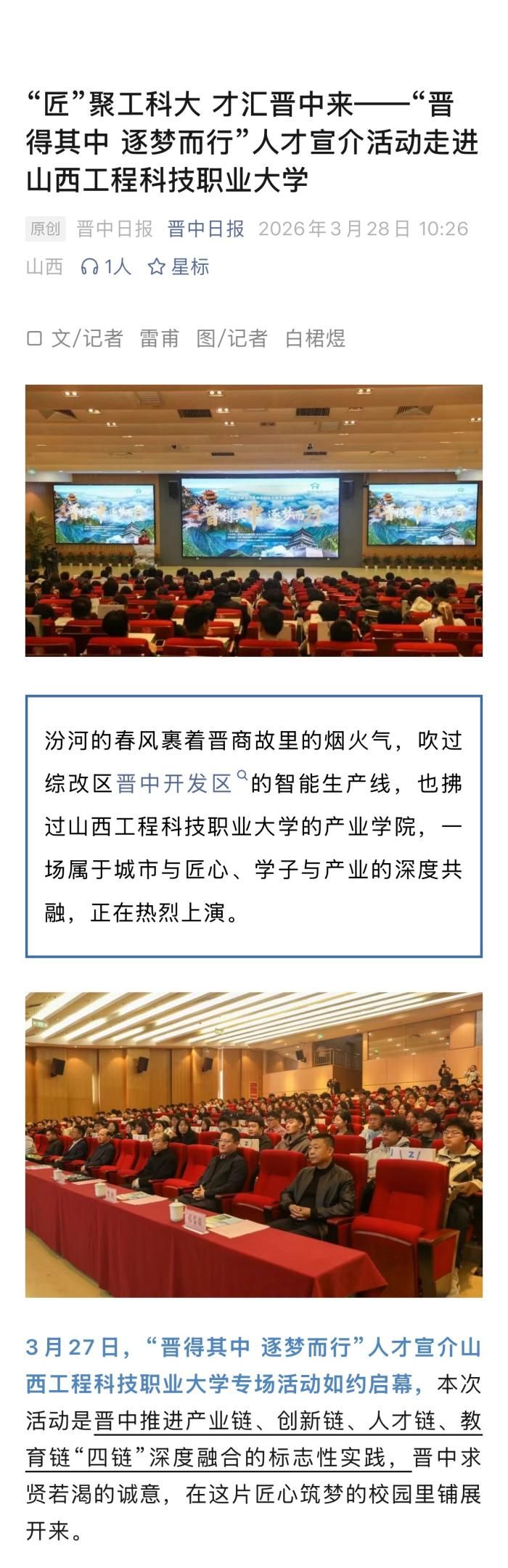 汾河的春风裹着晋商故里的烟火气,吹过综改区晋中开发区的智能生产线,也拂过山西工程科技职业大学的产业学院,一场属于城市与匠心、学子与产业的深度共融,正在热烈上演。